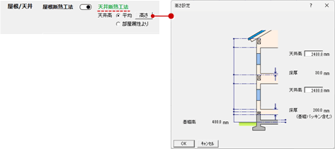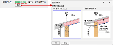 「高さ」をクリックして、屋根断熱時、断熱材の下端が垂木より下がる場合、垂木下端から断熱材下端までの距離を設定します。 ![]() |