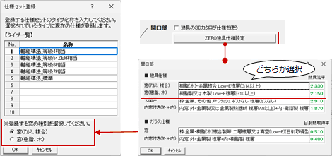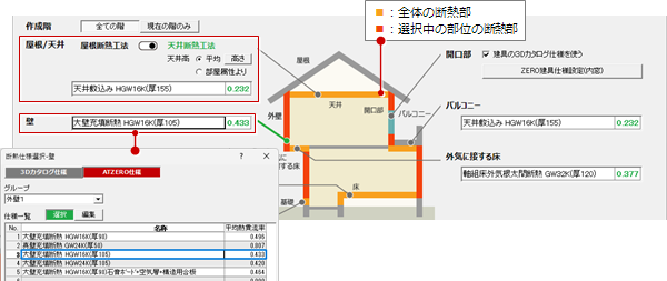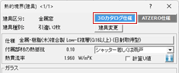 - 「開口部」で建具の仕様を3Dカタログ仕様かZERO建具仕様のどちらで計算するかを設定します。