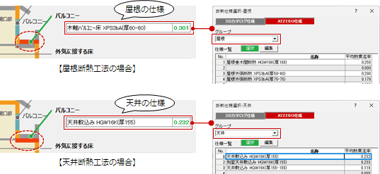 | バルコニー | バルコニーの仕様を設定します。 ・仕様名称をダブルクリックして仕様の変更・登録します。 仕様の登録方法については「断熱仕様登録」を参照してください。 ・「屋根/天井」でどちらの工法を使用するかによって、バルコニーの断熱仕様の初期値が変わります。 ![]() |