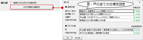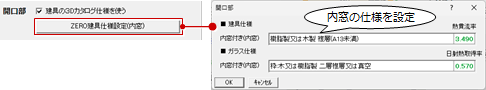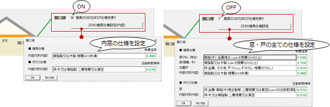 「建具の3Dカタログ仕様を使う」がONの場合は内窓のZERO仕様、OFFの場合は窓・戸全てのZERO仕様を設定します。