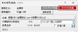 建具の仕様を設定します。 「建具の3Dカタログ仕様を使う」がONの場合 「3Dカタログ仕様」がONの「熱的境界(建具)」が配置されます。 「ZERO建具仕様設定(内窓)」で内窓の建具・ガラス仕様を設定します。 ![]() 内窓以外の窓・戸の仕様は建具の属性ダイアログの「ガラス種類」の仕様を使用します。 ![]() 「建具の3Dカタログ仕様を使う」がOFFの場合 「ATZERO仕様」がONの「熱的境界(建具)」が配置されます。 ![]() 「ZERO建具仕様設定」で建具・ガラスの仕様を設定します。 ![]() |
