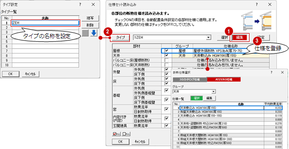 「OK」をクリックして「仕様セット読み込み」ダイアログで「編集」をONにします。「タイプ」から名称を設定して各部材の断熱仕様を設定して仕様セットに登録します。