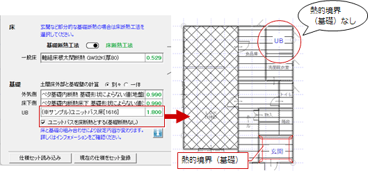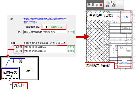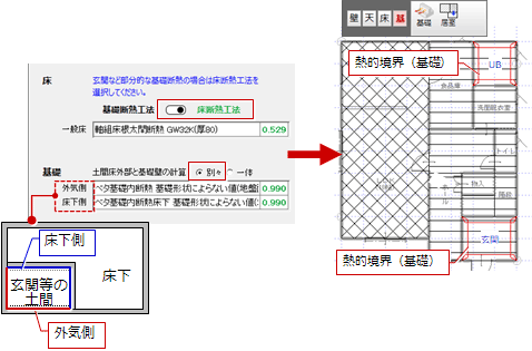 玄関や浴室等の基礎が対象になります。該当部分の外気側と床下側の基礎部分の仕様を設定します。