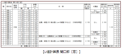 | 開口部[窓]表を別に配置 | U値計算表 開口部[窓]をU値計算表と別で配置するときはONにします。このとき、U値計算表の窓の仕様は「(別紙参照)」と表記されます。![]() |
