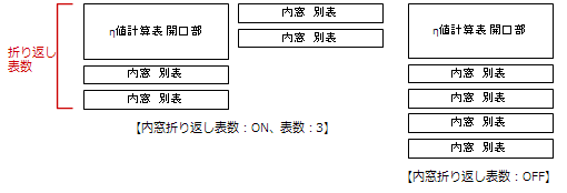 | 内窓折り返し表数 | 仕様表(開口部)と内窓の仕様表を配置するとき、折り返して配置する場合はONにして折り返し表数を設定します。OFFの場合は、縦一列に配置します。 |