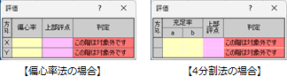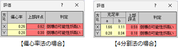 「概要設定」にある「計算方法」「配置低減計算方法」の設定によって、「偏心率」「充足率」と表示が違います。