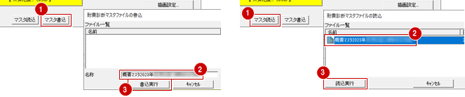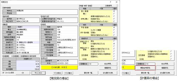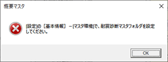 | マスタ読込/マスタ書込 | 【構造】【係数】【地盤・地形・基礎】、注意事項、総合所見などを「マスタ書込」で登録できます。登録した計算条件などを他の物件も使用するときは「マスタ読込」から読み込みます。![]() ※ マスタ読込・マスタ書込ができない場合は、「設定」の「物件初期設定:マスタ環境-共通マスタフォルダ」で「部品/設備他」タブの「耐震診断」のフォルダが設定されていることを確認してください。 ![]() |