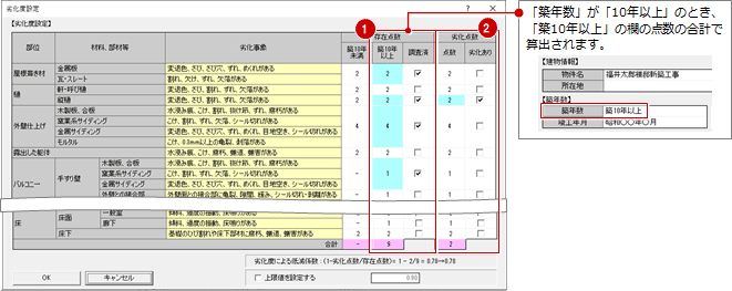 | 【築年数】 | 築年数 | 劣化度の低減係数に影響します。築年数が10年以上か10年未満によって、老朽度の調査部位が変わります。 「劣化度を設定する」を参照してください。 |