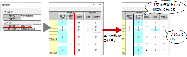 ※「概要設定」の「築年数」を「10年以上」で設定の場合は、「存在点数」の「築10年以上」の合計で算出されます。 - 調査済みの項目で劣化があった場合は、「劣化あり」をONにします。