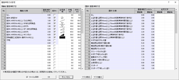 | 壁基準耐力 kN/m | 設定する面材仕様の「胴縁無」と「胴縁有」の値を設定します。 ※ この「壁基準耐力 kN/m」は、基準法の「壁倍率」とは異なります。 |