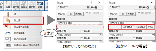| 筋かい | 筋かいの向き設定が不要な場合は、「筋かい」をOFFにします。 「耐力壁」ダイアログでOFFにした軸組仕様を選択した場合、筋かいの向きの設定は非表示になります。 ![]() |