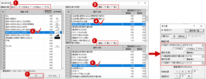 | 壁基準耐力 kN/m | 設定する軸組仕様の値を設定します。 ※ この「壁基準耐力 kN/m」は、基準法の「壁倍率」とは異なります。 |