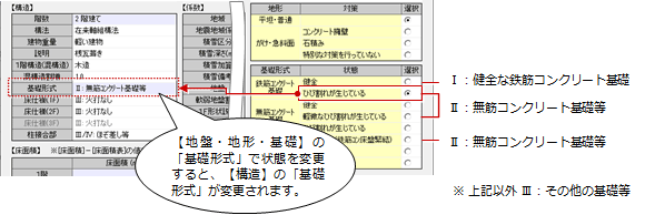 | 基礎形式 | 基礎形式を調査し、該当する項目をONにします。【構造】の「基礎形式」も変更されます。![]() |