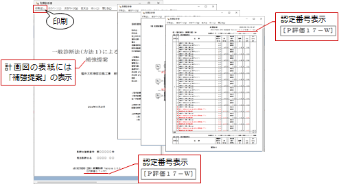 | 診断書出力 ボタン | 耐震診断書が表示され、計算の確認や診断書を印刷できます。 ・計画図の表紙には、「補強提案」の表示があります。 ・表紙の下部とヘッダーには、認定番号が表示されます。 ![]() |
