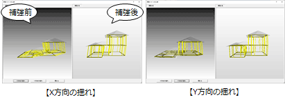 | 振動イメージの比較 ボタン | 計画図のみ表示されるボタンです。 X方向、Y方向の揺れをクリックすると振動し、補強前プランと補強後のプランで振動の違いを確認できます。 ※ 建物の倒壊は「振動イメージ」と同様です。 ※ 振動イメージ機能は、耐震診断評価の対象外です。 ![]() |