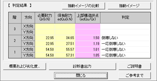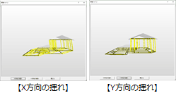 | 振動イメージ ボタン | 「X方向の揺れ」「Y方向の揺れ」をクリックすると振動します。 ※ 振動イメージで建物の倒壊は、「上部構造評点」が0.7未満のときに確認できます。 ※ 振動イメージ機能は、耐震診断評価の対象外です。 ![]() |