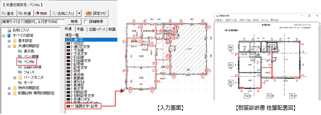 - 描画の設定は、「診断結果」ダイアログの「概要および劣化度」からも変更できますが、変更した場合に診断書の「柱壁配置図」に反映するには、一旦「診断結果」ダイアログを閉じて、「壁番号」メニューから「壁番号自動配置」ダイアログで「OK」をクリックする必要があります。