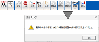 (間柱・木柱/2・木柱/4、柱タイプが「たれ、腰、たれ・腰、中」、非構造柱は対象外です。) - 「概要設定」の【計算方法】が「4分割法」で斜め壁があるプランでは、「診断結果」をクリックしたときに確認画面が表示されます。