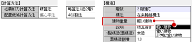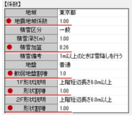 「概要設定」の「地震地域係数」「積雪加算」「軟弱地盤割増」「形状割増」の値がセットされます。物件にあった係数がセットされているかを確認します。 ![]() |