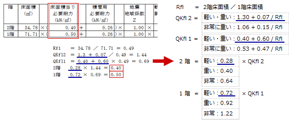 | 床面積当り必要耐力 | 「概要設定」の「必要耐力計算方法」の「精算法」「略算法」、「建物重量」で係数が変わってきます。![]() 例:精算法による計算 ![]() |