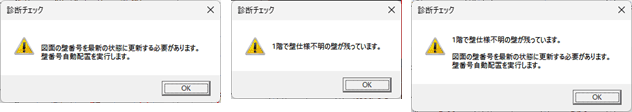 例えば、耐力壁を追加、変更、削除した後に「壁番号自動配置」を行っていない場合、計画図で耐震診断をするときに「仕様不明壁」がONの耐力壁が残っている場合は、確認画面が表示されます。