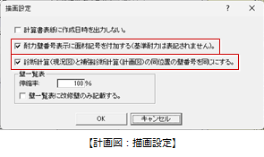 柱壁配置図には、その他にも「概要設定」の「描画設定」にある、以下の設定が影響します。どういった柱壁配置図が必要なのかは申請機関に確認してください。