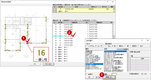 - 「柱脚金物」も変更します。セルをクリックして、「金物選択」ダイアログで金物を選択します。
