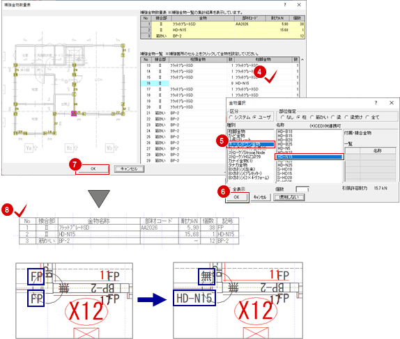 - 「OK」で閉じていくと、マウスに補強金物一覧表が表示されるので、配置位置でクリックします。