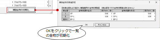 「数量」メニューの「補強金物数量表」を表示して、金物を変更し表を再配置します。 - 「補強金物の初期化」をクリックすると「概要設定」の「補強金物設定」で設定した金物が表示され、「OK」をクリックすると「補強金物初期化設定」の内容で、「補強金物数量表」の金物が初期化されます。また、「補強金物初期化設定」ダイアログでは金物変更も可能で、「概要設定」の「補強金物設定」と連動します。