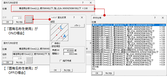 | 仕様 | 面材の仕様や倍率を「床材仕様」ダイアログ、「屋根材仕様」ダイアログから選びます。 一覧にない場合は、「その他」を選んで、仕様の名称、倍率を設定します。 |