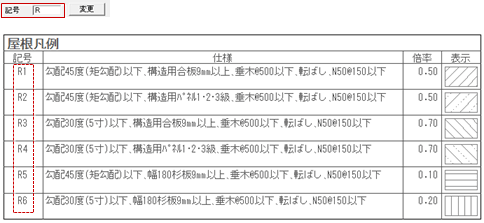 床材、屋根材、火打材の凡例表で表記する記号は、「記号」で設定します。半角で4文字まで入力できます。