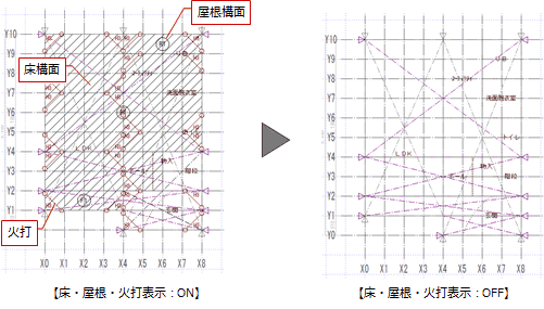 耐力壁線・耐力壁区画・床構面・屋根構面・火打構面を表示・非表示を切り替えする