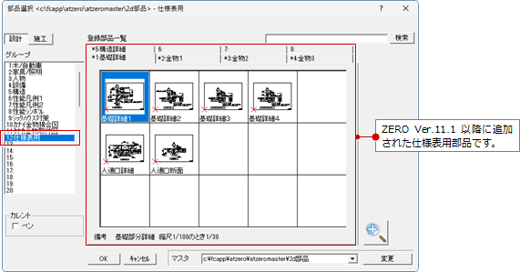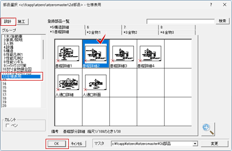 2D部品マスタの「仕様表用」グループに基礎や構造の詳細図が登録されています。2025年2月版以前のプログラムを更新した場合は、「仕様表用」グループが登録されていません。FCアカウントにアップされている更新ツール等を利用して「仕様表用」グループの部品を取り込んでください。
