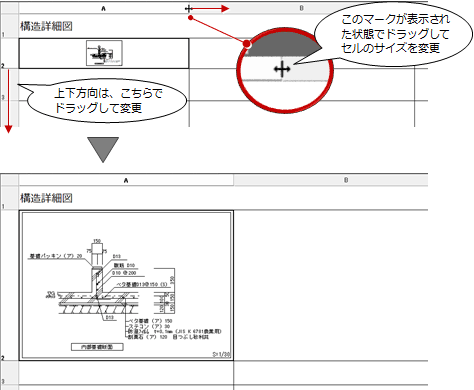 指定方法 説明 セルに合わせて伸縮 納まり図を配置した後、セルのサイズを変更して納まり図の大きさを変更できます。 登録サイズで配置 部品マスタに登録したときのサイズのまま配置します。セルのサイズを変更しても、配置した納まり図の大きさは変わりません。 - セルの大きさを変更します。
