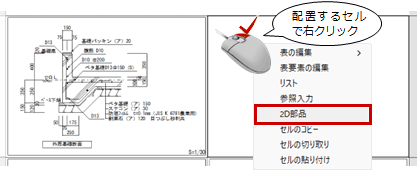 配置する納まり図のセルを右クリックして表示されるメニューから「2D部品」を選んで配置することもできます。