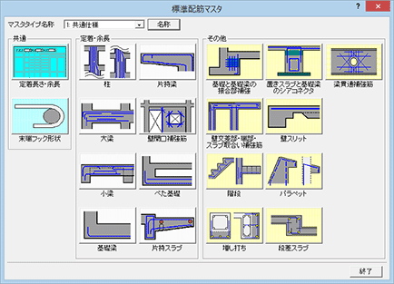 - 「処理選択」ダイアログの「マスタ」をクリックして「標準配筋マスタ」を選びます。