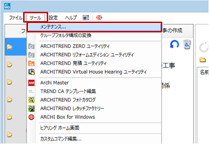 - ARCHITREND Manager 2015を起動して、「ツール」-「メンテナンス」をクリックします。