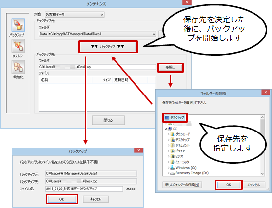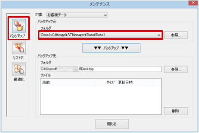 - 「バックアップ」をクリックし、バックアップ元のフォルダリストから、バックアップするお客様データフォルダを選択します。