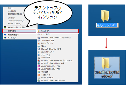 - デスクトップに、バックアップ用に新規フォルダを作成します。