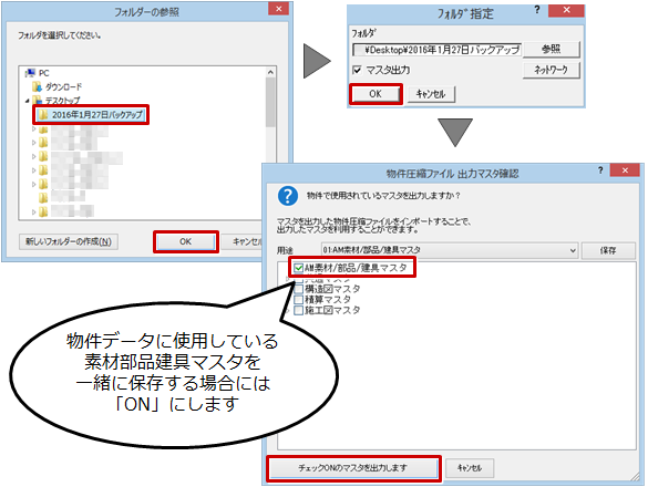 ※「マスタ出力」のチェックがOFFの場合には、「物件圧縮ファイル 出力マスタ確認」ダイアログは表示されません。