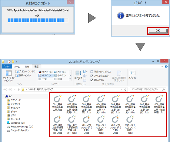 - 処理が開始され「正常にエクスポート完了しました。」と表示されます。「OK」をクリックします。デスクトップに作成したフォルダの中に、fcbz形式のデータが作成されていることを確認します。