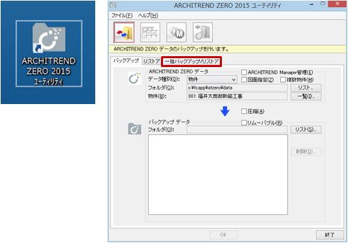 - バックアップした「○○○○○.ZMA」ファイルは、ARCHITREND ZERO ユーティリティを使用して「一括リストア」することができます。
