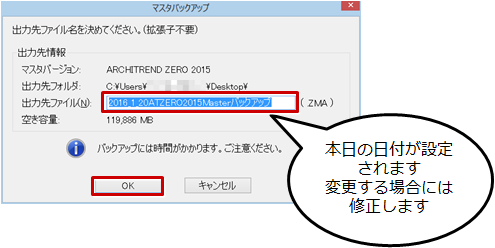 - 出力先ファイル名には、本日の日付が設定されます。変更する場合には名称変更して、「OK」をクリックします。