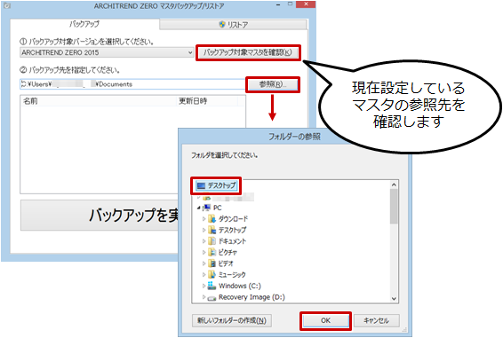 - 「バックアップ対象マスタを確認」をクリックして、参照しているマスタに問題がないかを確認します。