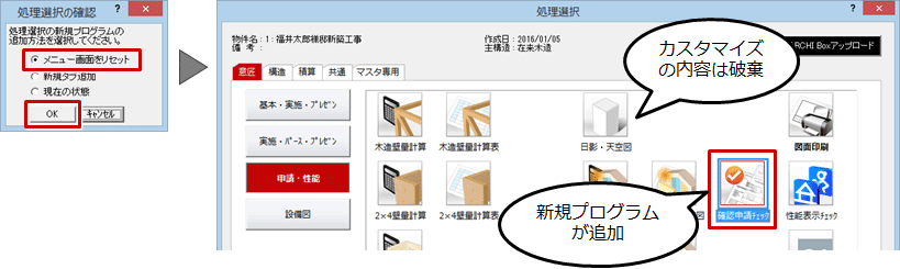 カスタマイズした処理選択の内容をリセットして(フルメニューに変更)、新規プログラムが追加された処理選択の内容に変更します。カスタマイズした処理選択の内容は消えてしまいます。主に処理選択をカスタマイズしていない場合に選びます。