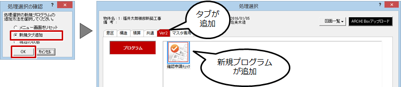 A:バージョンアップで新規プログラムが追加された場合に「処理選択の確認」ダイアログが開きます。処理選択への新規プログラムの追加方法を指定します。