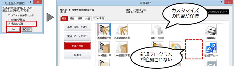 カスタマイズした処理選択の内容を破棄せずに、新規プログラムを手動で追加したいときに選びます。ダイアログ下部の「マスタ切替」メニューの「カスタマイズ」で、個別にアイコンを追加してください。