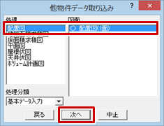 - 「他物件データ取り込み」ダイアログで、取り込む図面の物件を選んで「次へ」をクリックします。