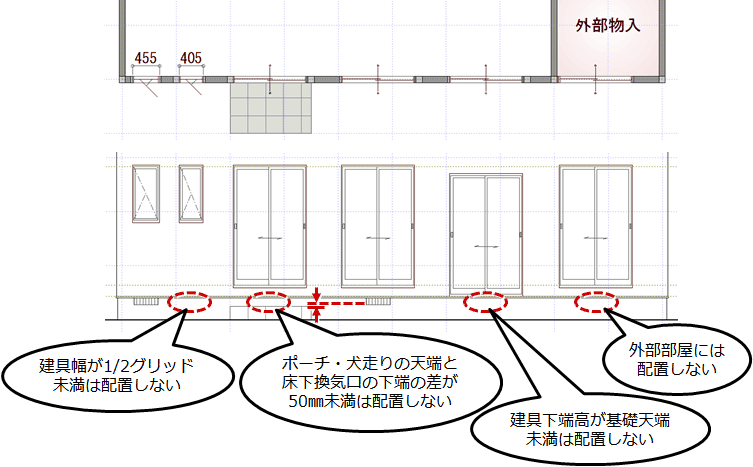A:床下換気口は、1階の建物外周の建具を考慮して自動配置されますが、次の条件を満たしていない場合は配置されません。