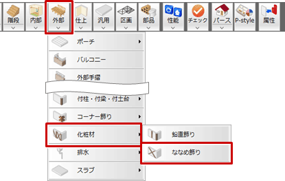 - 「外部」メニューから「化粧材」の「ななめ飾り」を選びます。